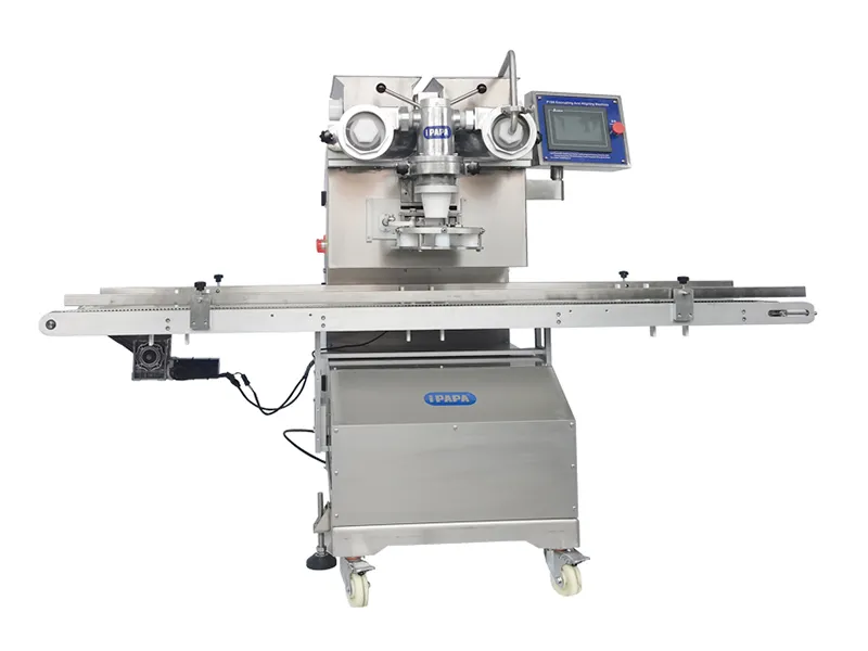 The mochi machine features three hoppers, allowing you to produce dual-color or dual-filling products effortlessly. You can easily adjust product size, shape, and the dough-to-filling ratio to match your production needs. This confectionery machine is customizable to fit different baking trays or plastic trays. With its automatic tray arrangement system, your products are directly placed onto the trays without manual handling, reducing labor costs while maintaining product shape and hygiene.